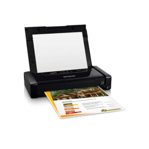 Impresora portátil Epson WorkForce WF-100 inalámbrica a color con conectividad Wi-Fi y batería integrada, ideal para profesionales que necesitan imprimir documentos y fotos desde dispositivos móviles en cualquier lugar.